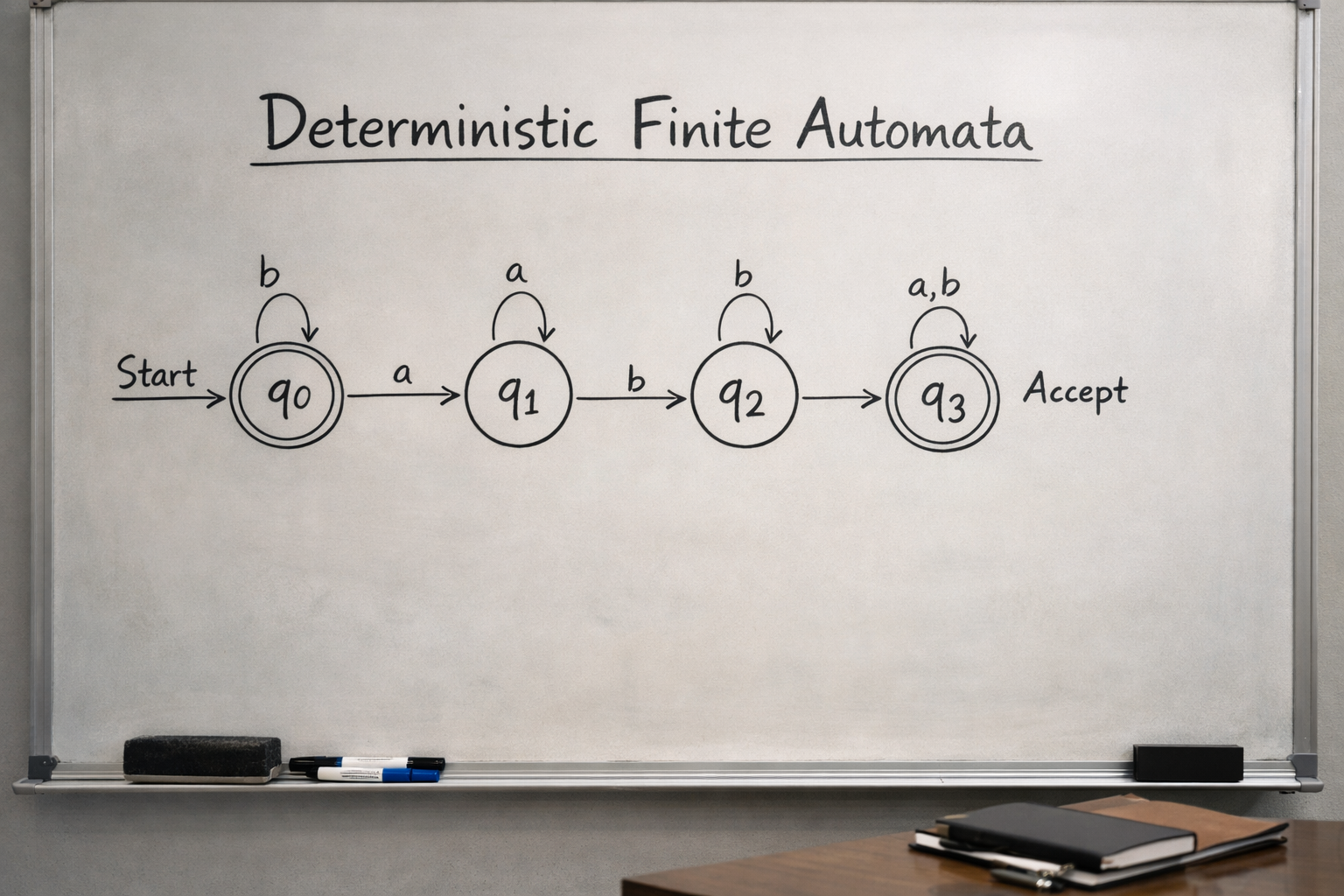 A deterministic finite automata is a theoretical machine used in the study of computation. It consists of a finite number of states and transitions between those states based on input symbols. The term “deterministic” means that for every input, the machine has exactly one possible action.